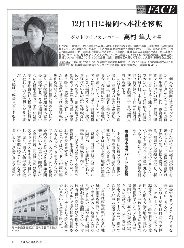 2017.12.01 メディア 「くまもと経済」に掲載されました。 2017年12月号 vol.438くまもと経済 くまもと経済の今を伝える情報誌「くまもと経済 vol.438」に本社移転についてのインタビュー記事が掲載されました。